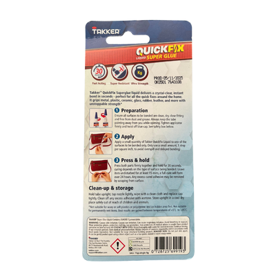 The Takker QuickFix Liquid Super Glue is a high-performance instant adhesive engineered for fast, precision bonding across a wide range of household materials. Designed with an easy-flow applicator for clean, controlled application, this crystal-clear liquid formula delivers a super-strong, ultra-resistant bond in seconds, making it ideal for quick repairs and DIY projects around the home, office, or workshop.