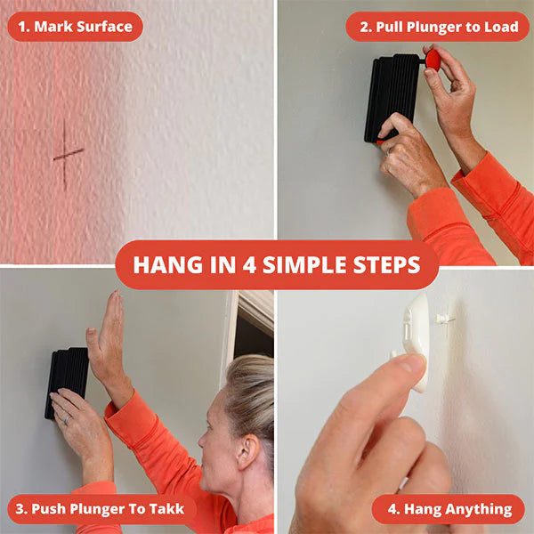 Are you tired of electric drills, screwdrivers, screws, wall plugs, and hammers that are always making a mess and damage to your walls? Need something simple and unique tool that will help you to hang your favourite pictures and accessories in a second without trying hundreds of times? If your answer is YES, then STOP SEARCHING because with Takker you’ll get picture-perfect results every time you use it.